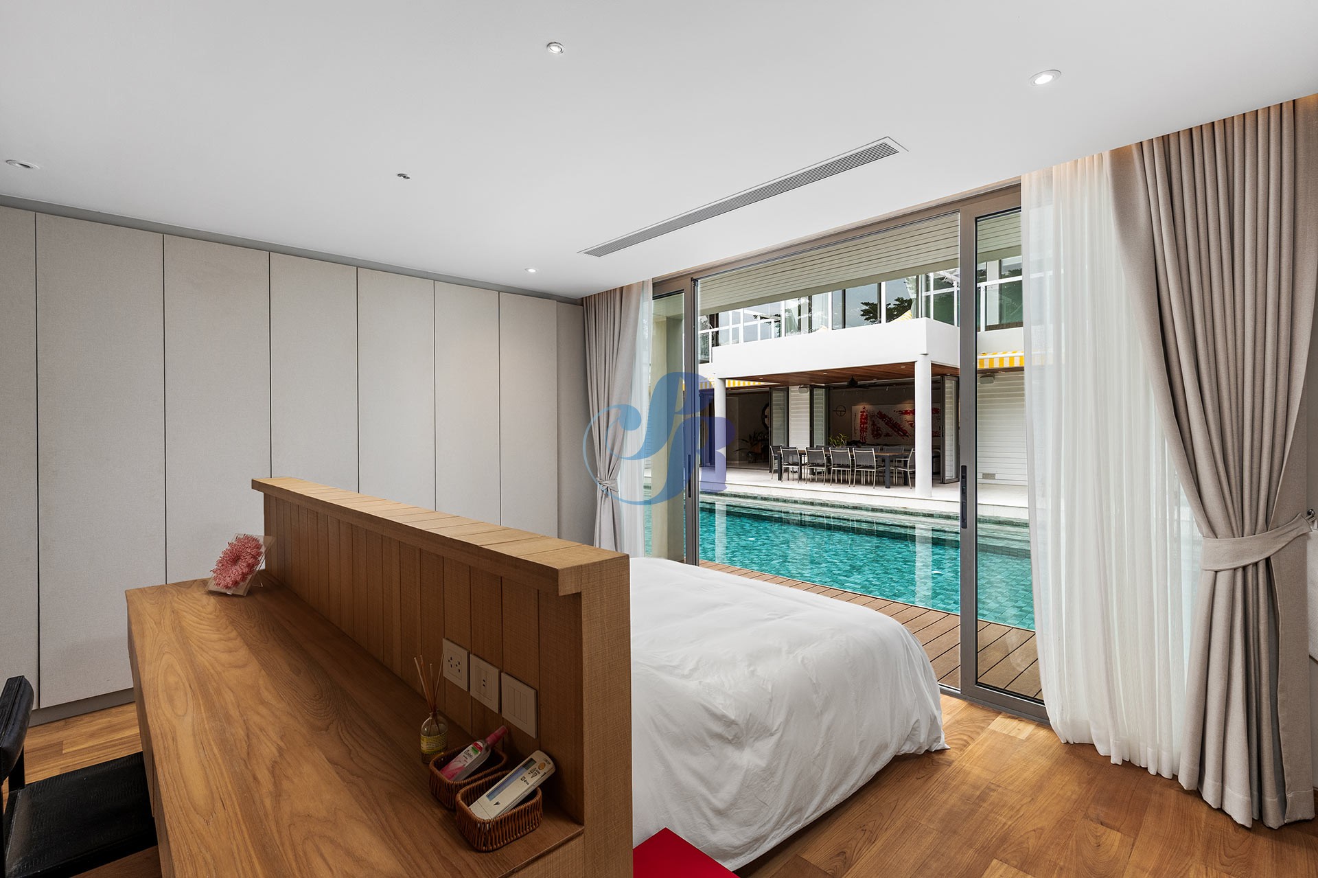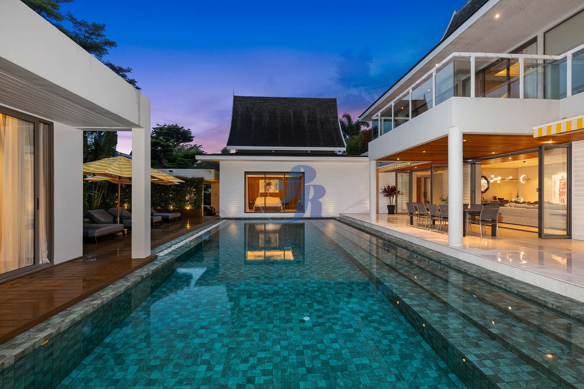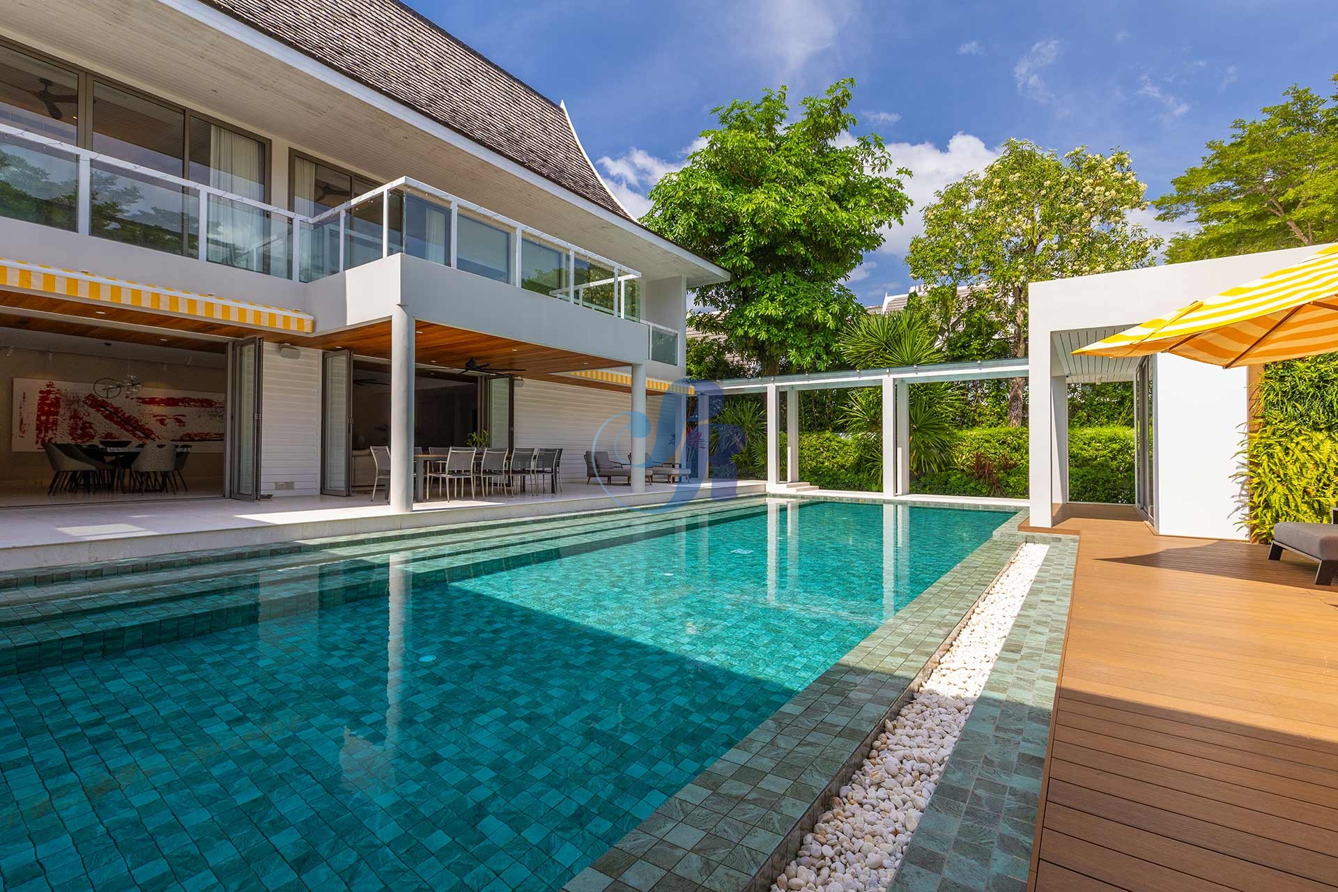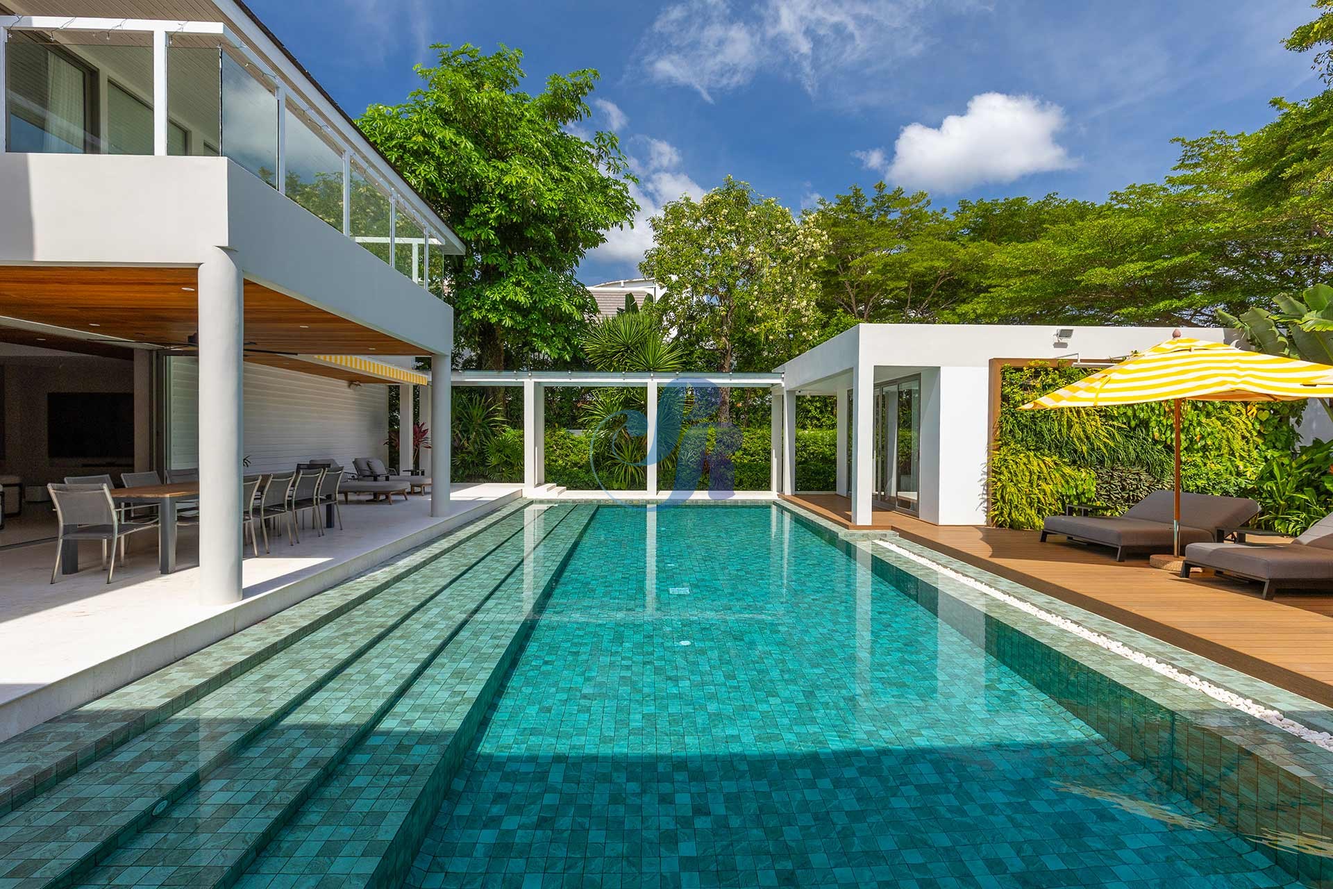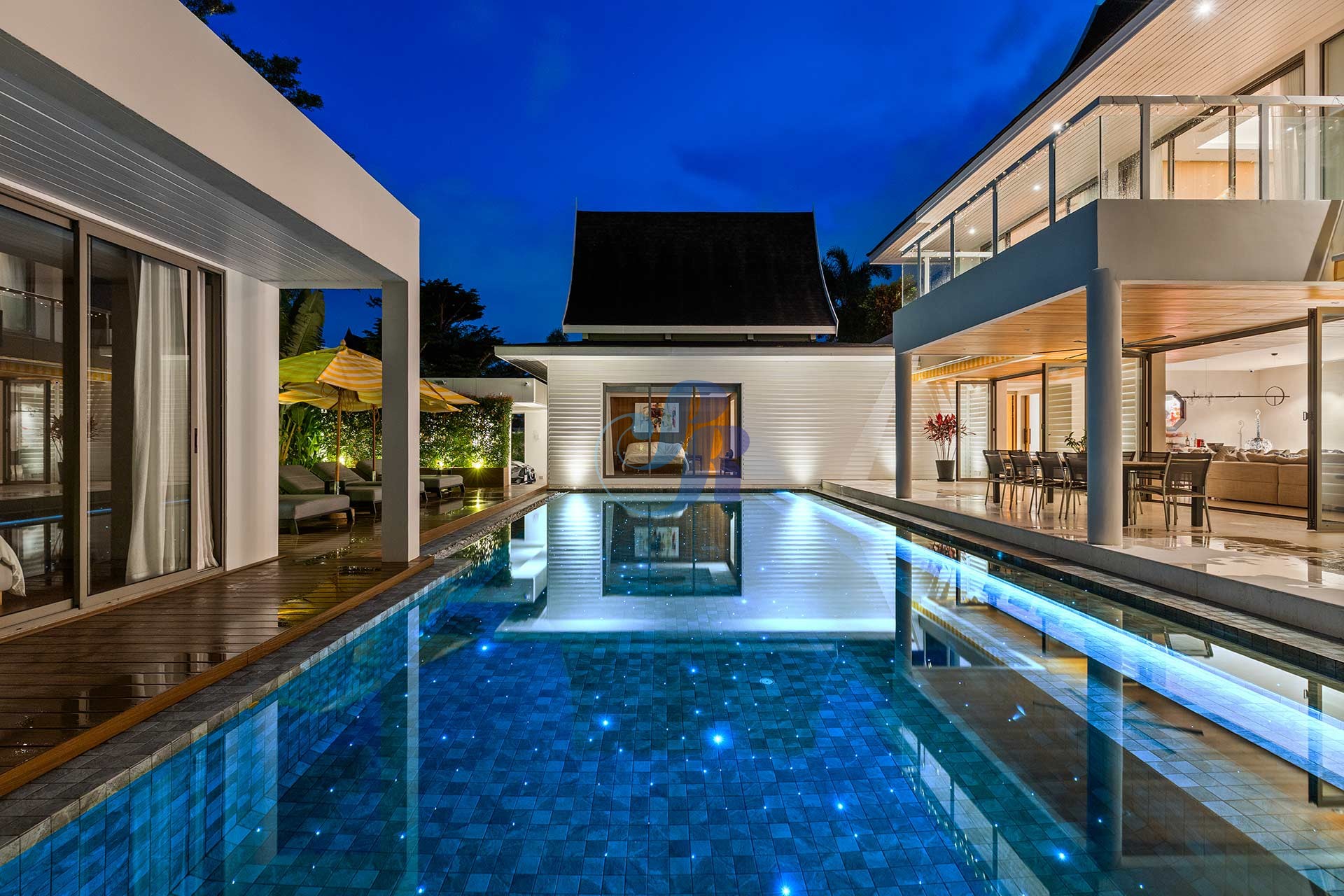 Резиденция включает в себя пять просторных спален и пять ванных комнат, а также отдельную прачечную и крытую парковку на два автомобиля. В центре зоны отдыха на открытом воздухе расположен впечатляющий бассейн размером 20 на 6 метров, украшенный архитектурной светодиодной подсветкой, создающей элегантную атмосферу как для дневного отдыха, так и для вечерних развлечений.