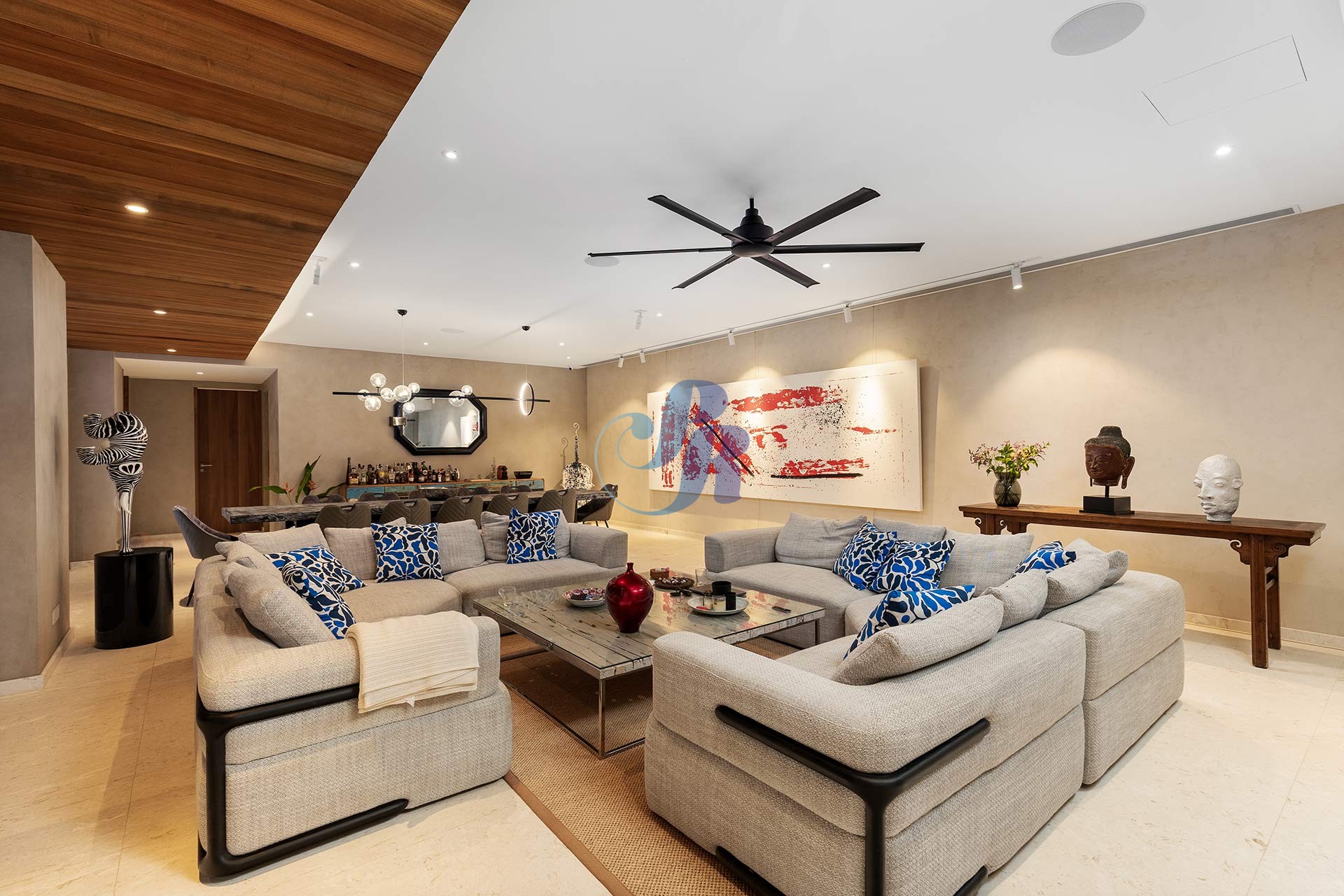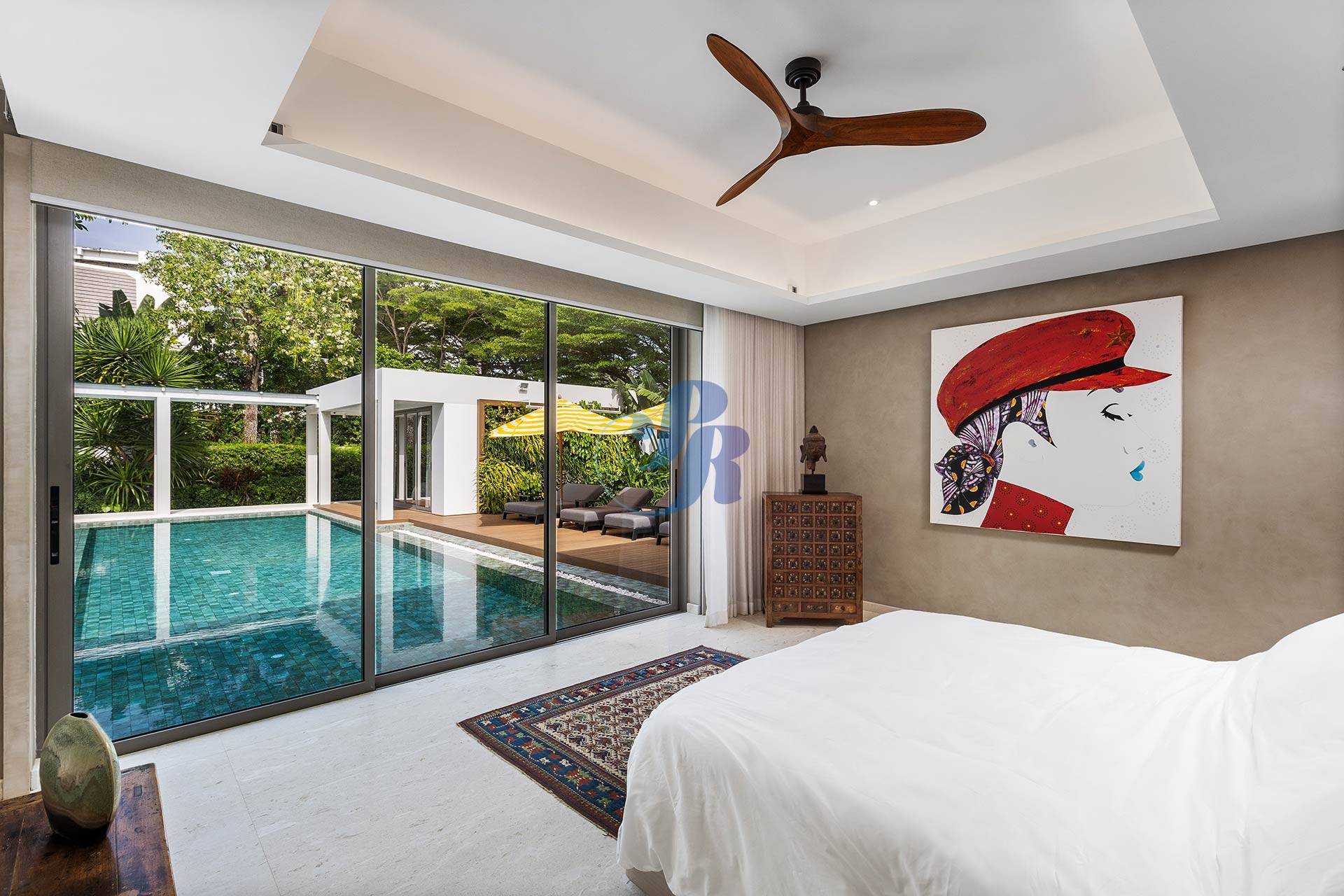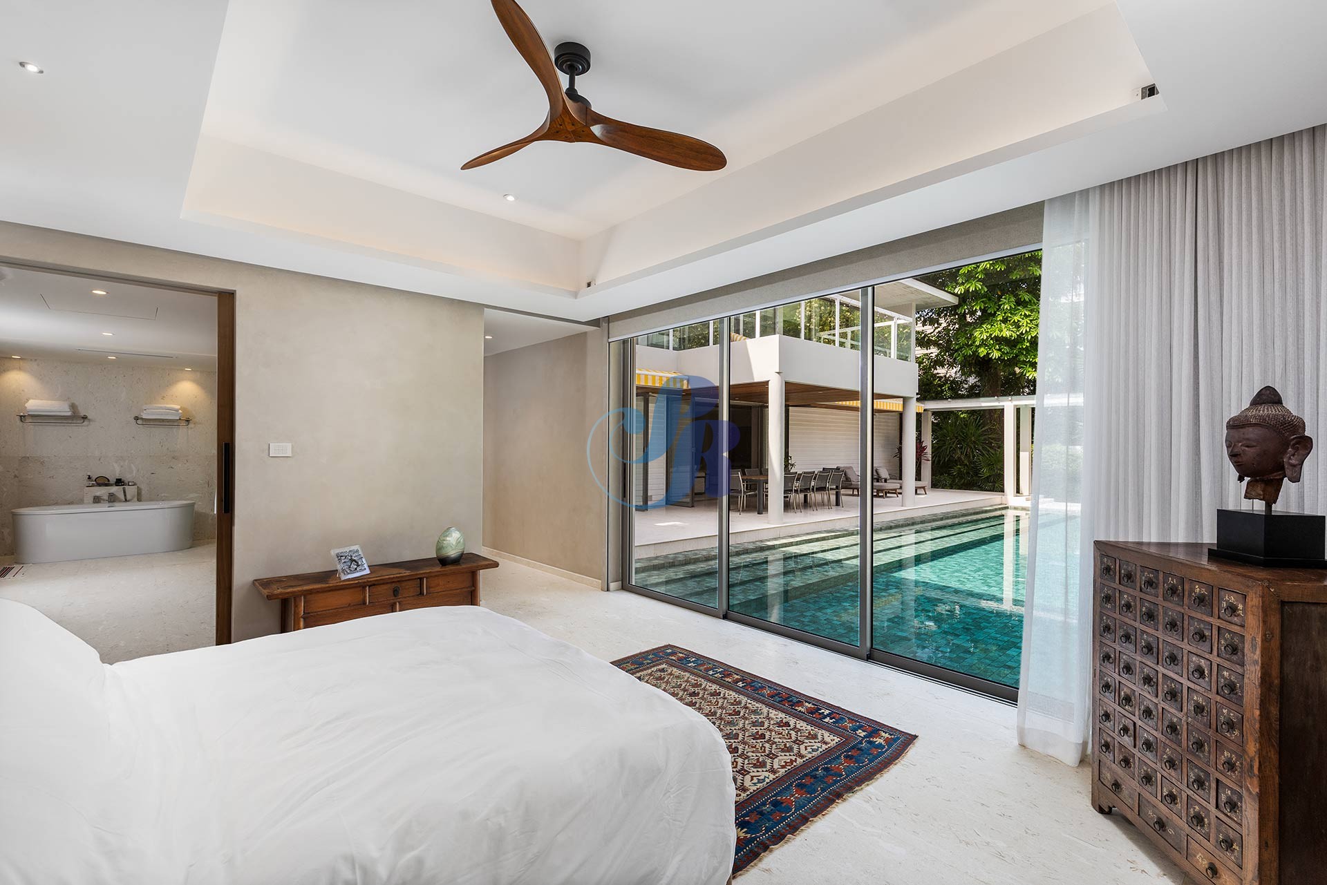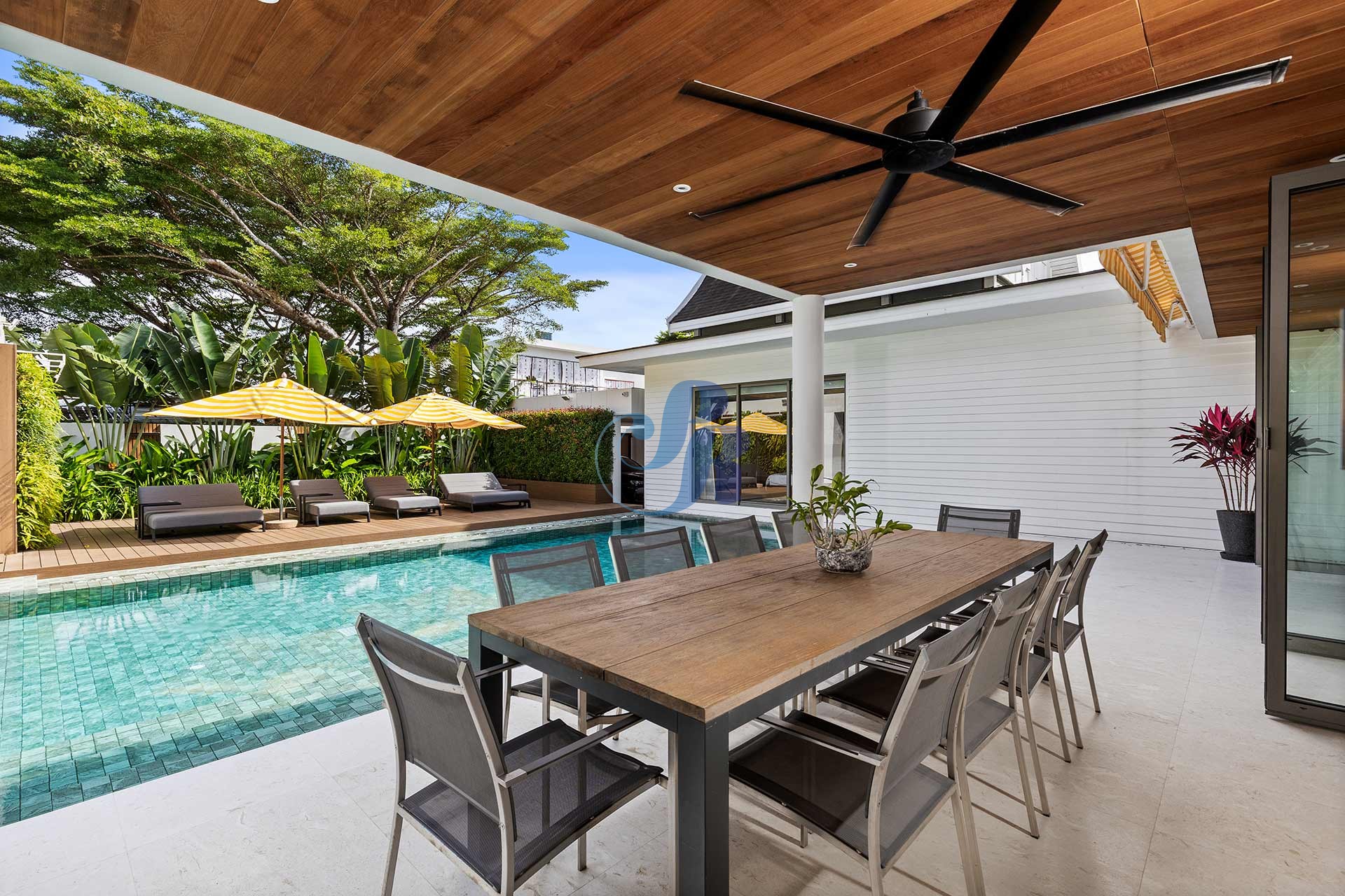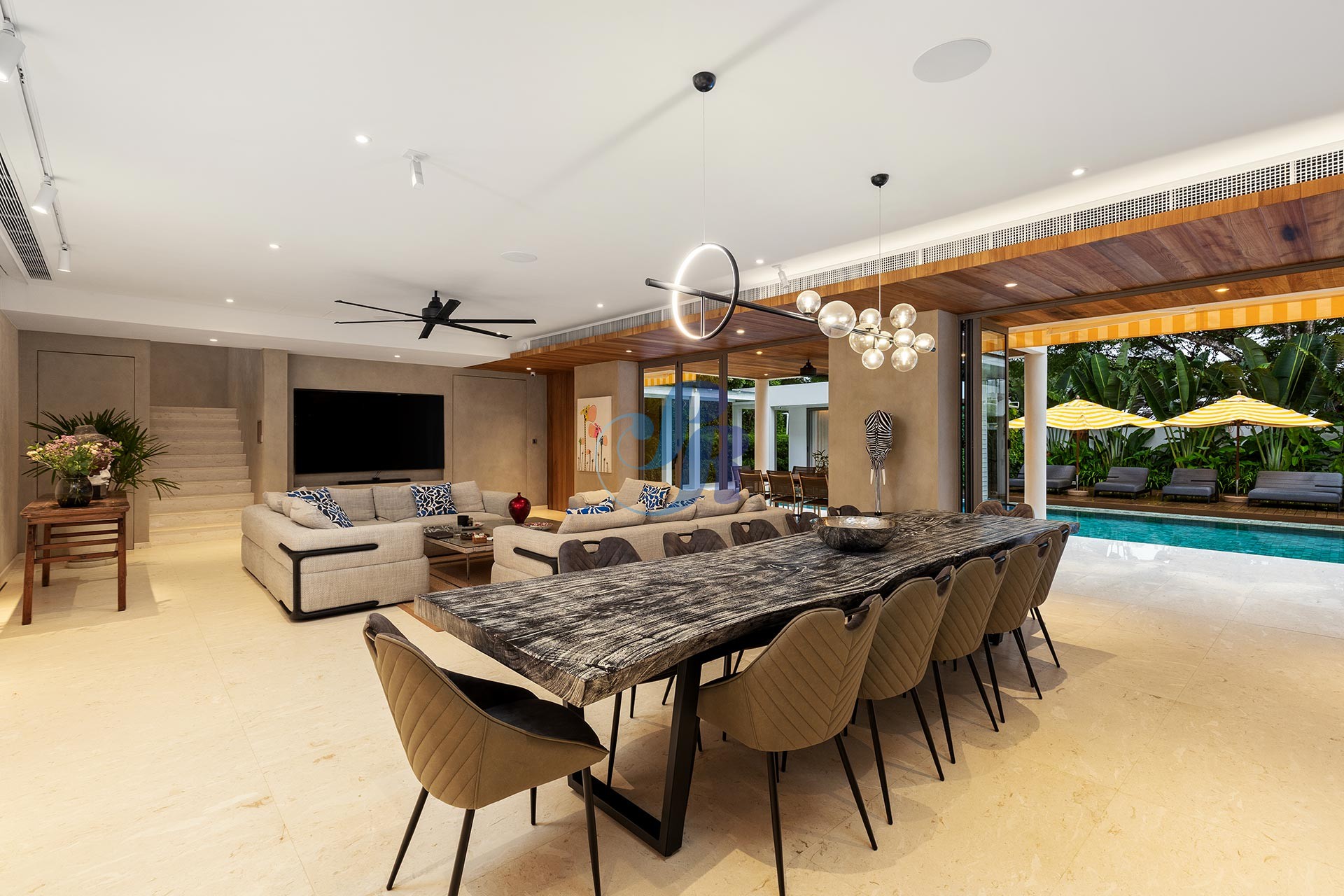 Резиденция включает в себя пять просторных спален и пять ванных комнат, а также отдельную прачечную и крытую парковку на два автомобиля. В центре зоны отдыха на открытом воздухе расположен впечатляющий бассейн размером 20 на 6 метров, украшенный архитектурной светодиодной подсветкой, создающей элегантную атмосферу как для дневного отдыха, так и для вечерних развлечений.