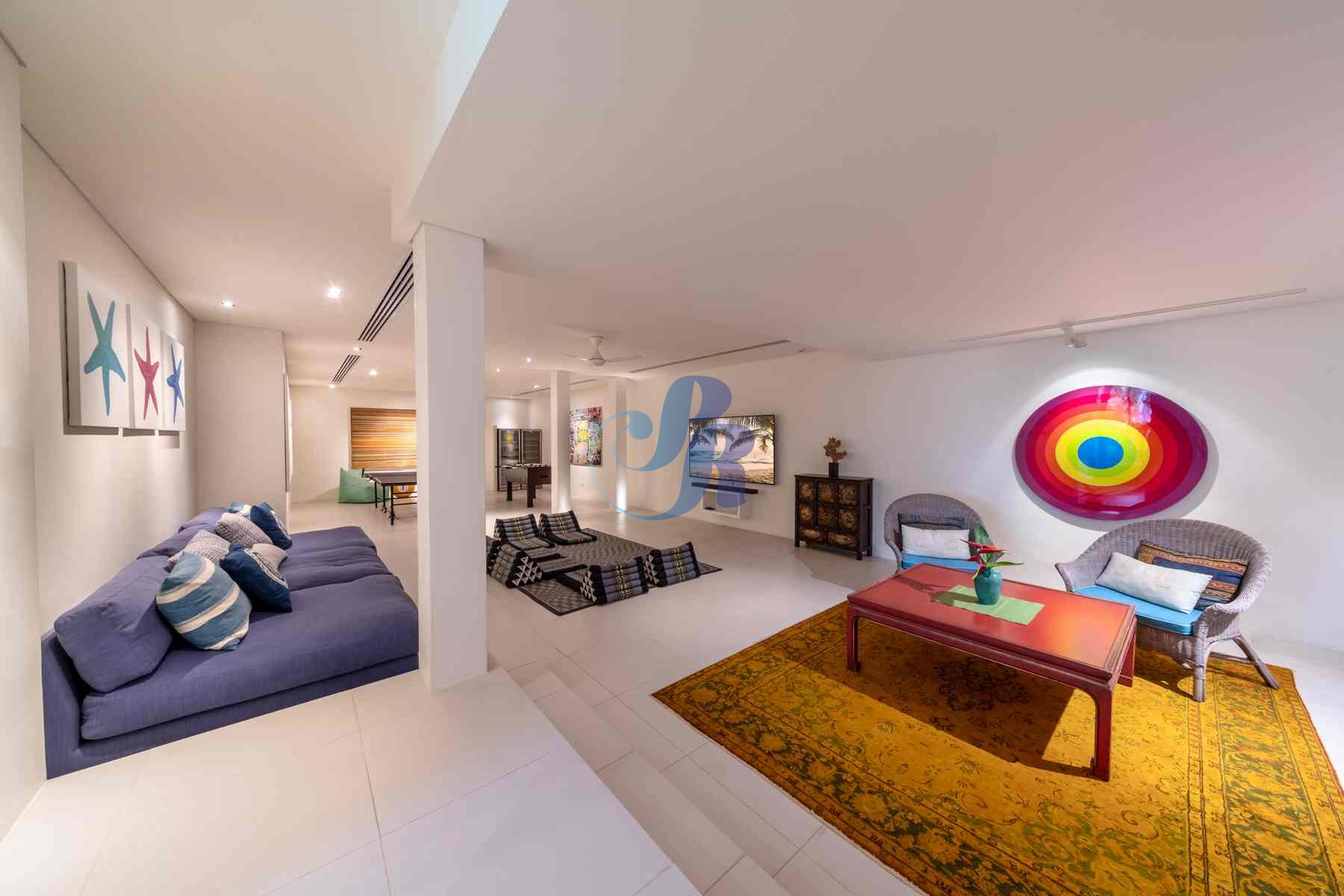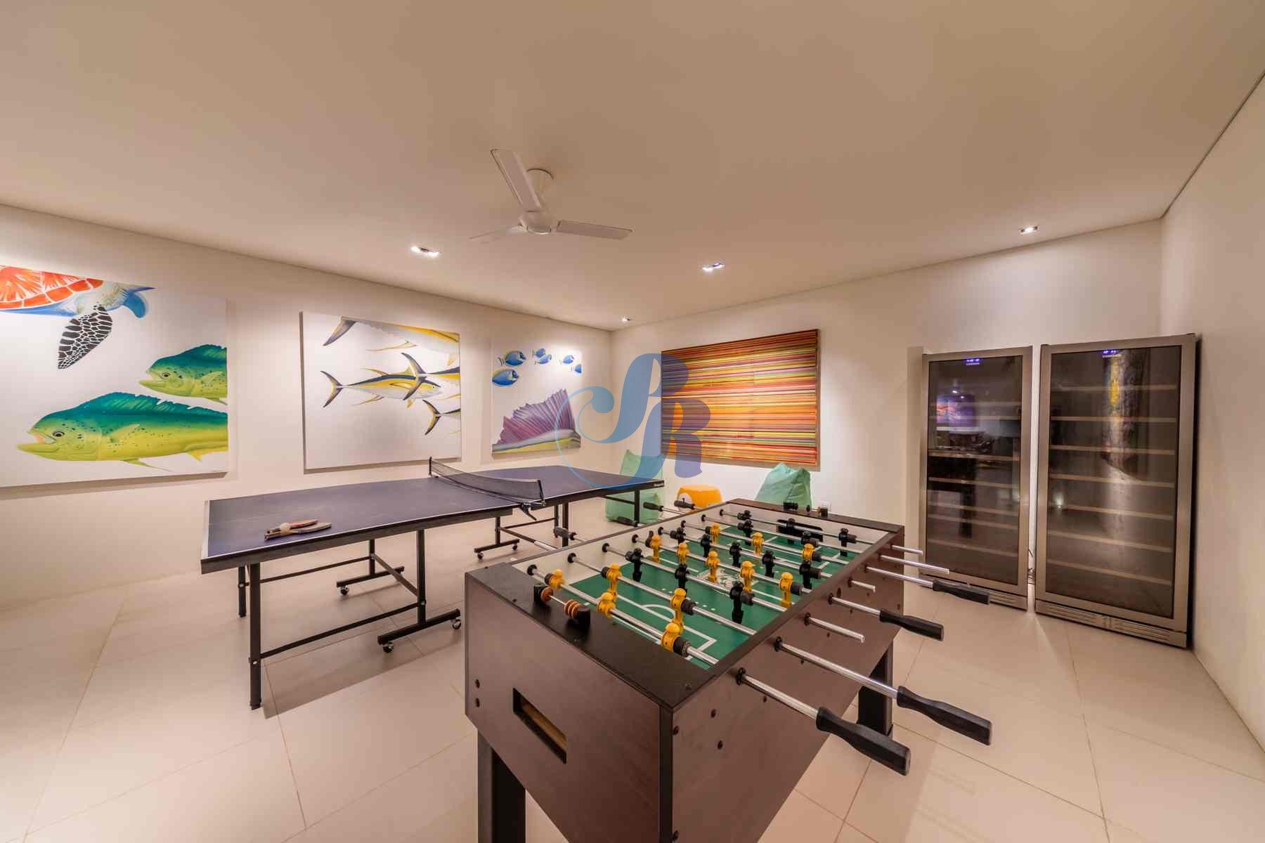 Отдельная медиа/семейная комната и комната для развлечений предоставляют дополнительное пространство для отдыха, оборудованное настольными играми, настольным футболом, настольным теннисом и винными холодильниками.